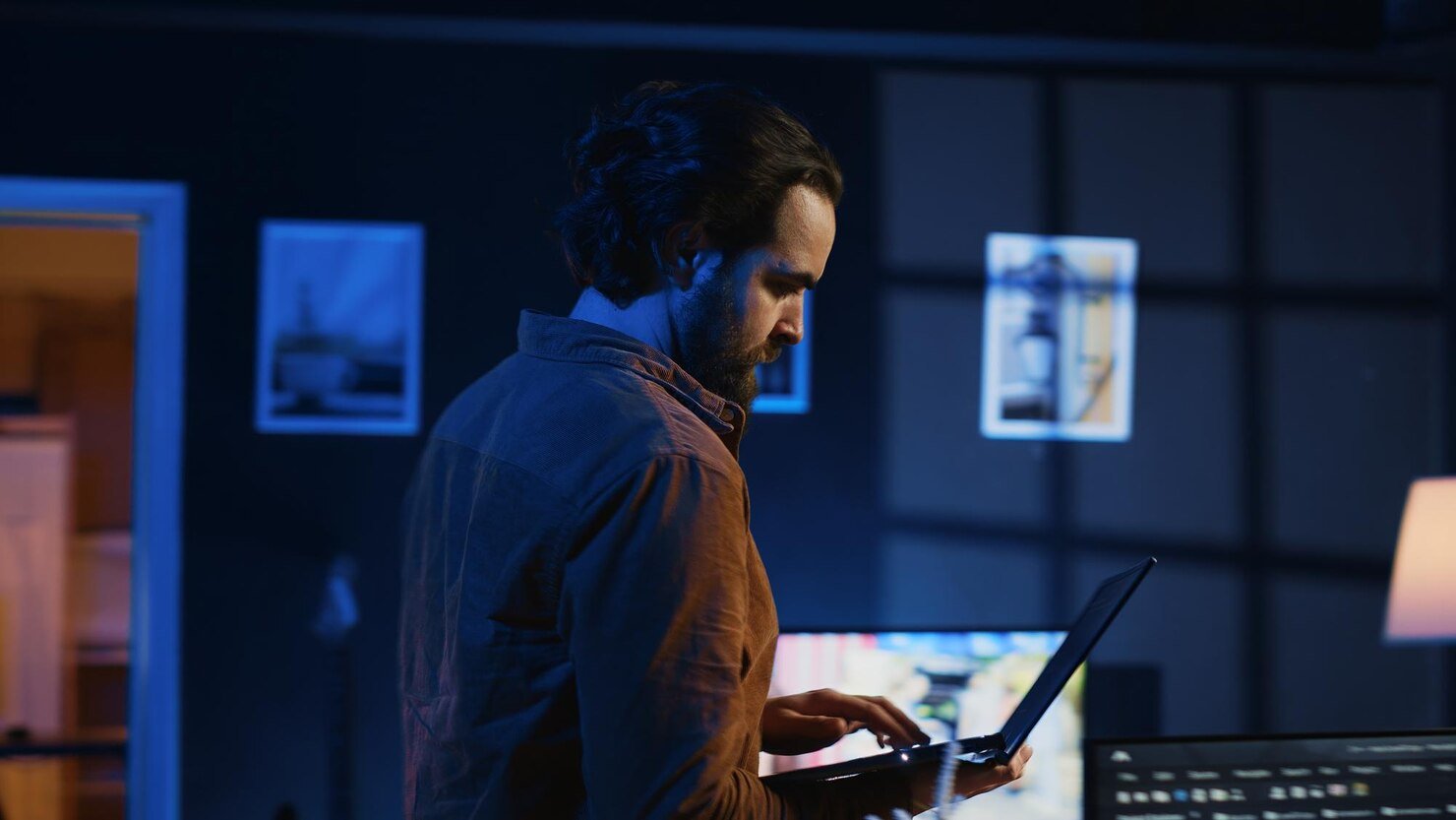 man-doing-it-support-job-from-home-walking-around-personal-office-with-laptop_482257-92977